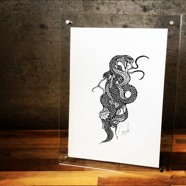 『執着心』の象徴である蛇を用いて、大切なものを締め付けすぎて自分自身を傷けてしまう様子を描きました。